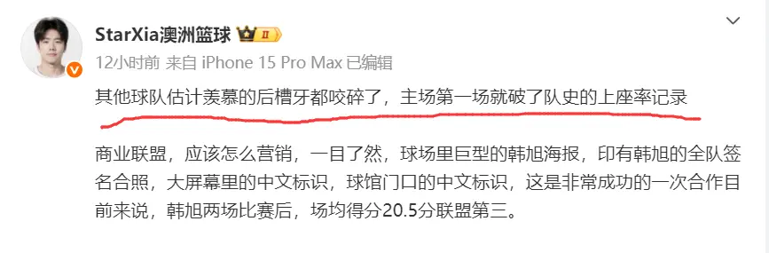 3121人,这是韩旭加盟澳洲联赛珀斯山猫队主场首秀,现场球馆的上座人数。尽管澳洲联赛球馆并不大,不过,在得知韩旭加盟澳洲联赛后,还是有不少海外华裔前往现场支持韩旭和中国队。这不,在仅仅加盟珀斯山猫队2场比赛,韩旭便成为了球队的当家球星,不仅关注度和曝光度非常高。而且,这一次山猫队主场首秀,韩旭的亮相还帮助他们打破队史纪录,上座率创造历史新高。